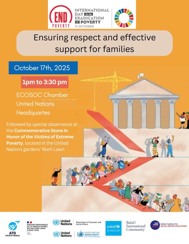 The International Movement ATD Fourth World and the International Committee for October 17th, invite you to the 33rd commemoration of the International Day for the Eradication of Poverty at the United Nations on Friday, October 17th.