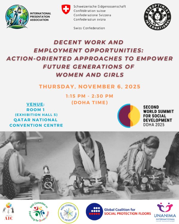 Join us in the Solutions Session (Side-Event) "Decent work and employment opportunities: Action-oriented approaches to empower future generations of women and girls" at the second UN World Summit for Social Development, Doha Qatar (November 4-6, 2025)